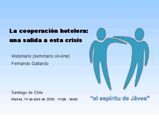 El webinario, que lleva por título “La cooperación hotelera: una salida a esta crisis”, contempla la imagen en vivo del ponente en teleconferencia desde Santiago de Chile, acompañada de una presentación monitorizada que emula las habituales ponencias sobre pantalla de sala. Los asistentes podrán chatear mientras tanto entre sí o formular preguntas por escrito al ponente, que serán respondidas al término de la charla, una hora después. Y si alguno dispone además de cámara web y micrófono podrá pedir la palabra y, tras serle concedida, podrá dirigirse a la audiencia igualmente en vivo, con sonido e imagen.