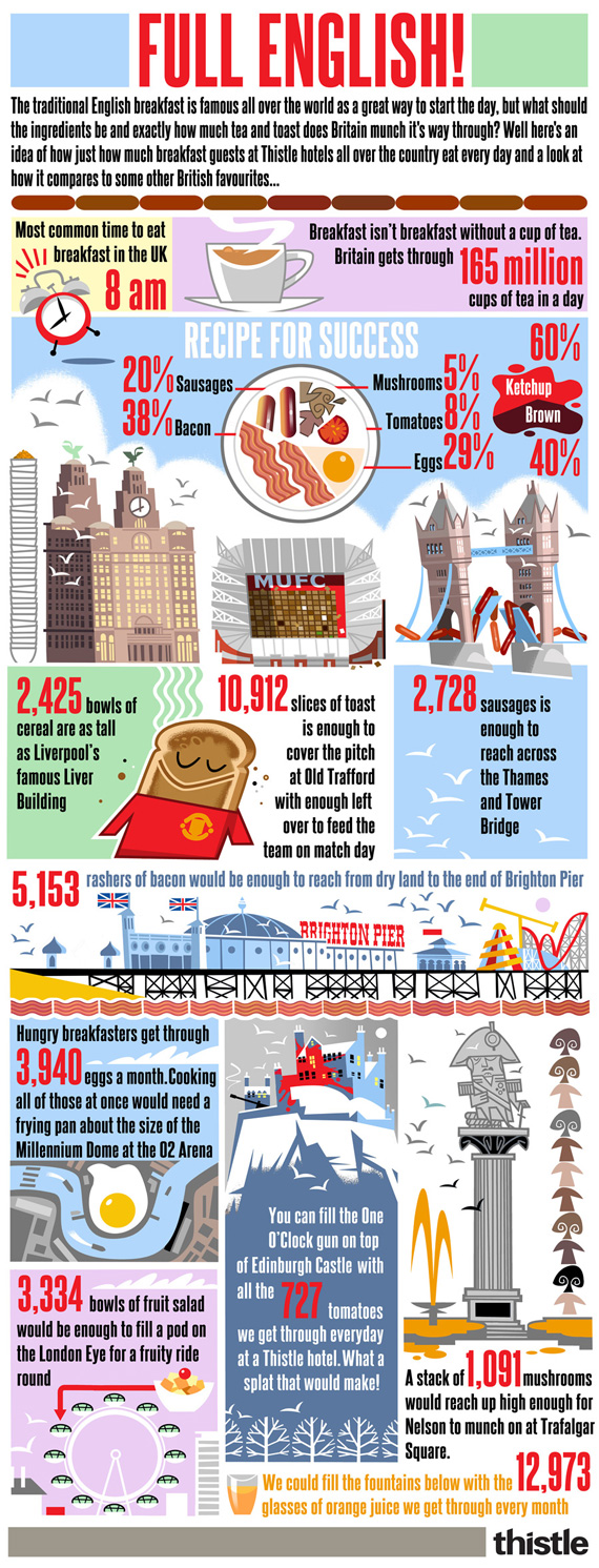 Como apunte meramente informativo, la cadena hotelera Thistle ha publicado en su web Thistle.com una infografía «a la americana» con todos los datos estadísticos, comparativos y anecdóticos sobre esta colación gruesa entre los turistas británicos. La hora más frecuentada en sus hoteles para desayunar es la de las ocho de la mañana o’clock. En ese instante de desperezo masivo, los bufés de estos hoteles aparecen repletos de ricos cereales (2.425 boles) que cubrirían la altura del edificio Liver en Liverpool. Suficientes para cubrir el mítico estadio de Old Trafford, un total de 10.912 tostadas esperan a ser devoradas por los comensales aún soñolientos. ¿Salchichas? Sí, sí, les mola un montón eso de engullir salchichas a hora tan temprana: un total de 2.728. Y grasiento bacon (5.153 lonchas) que jalonaría el muelle Brighton, de por sí muy largo.