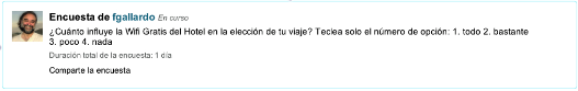 PD. Muchas gracias a todos los amigos de Twitter y de Facebook que se están empeñando hoy en retuitear la encuesta. Y especialmente a la revista Hosteltur (@hosteltur) por su alcance y por estar siempre «al loro» de la noticia turística. Los resultados pueden seguirse al minuto en: Encuesta Wifi Gratis.