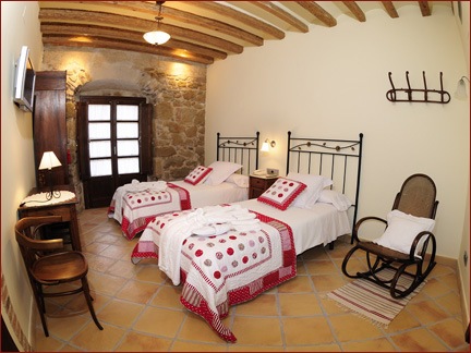 Jesús Castillo Oli, arquitecto: “La habitación responde plenamente al modelo neorural. A destacar las camas de hierro forjado (de imitación claro), la bonita lámpara de mesa de hierro forjado (nuevamente de imitación), el solado de gres colocado a cartabón con junta de un centímetro de cemento, el forjado de vigueta de madera y revoltón, la carpintería de madera con cuarterones (echo de menos el visillo de la abuela)… Los muebles, sin embargo, sí que mantienen el cojincito y el paño como Dios (o la abuela) manda. Y las colchas-jarapas, como siempre, aportando esa interesante nota de color. Al fin, la tecnología… Una pantalla de plasma que te crió de frente a la cama. O sea, un completo de rusticidad con toda su piedra vista.”