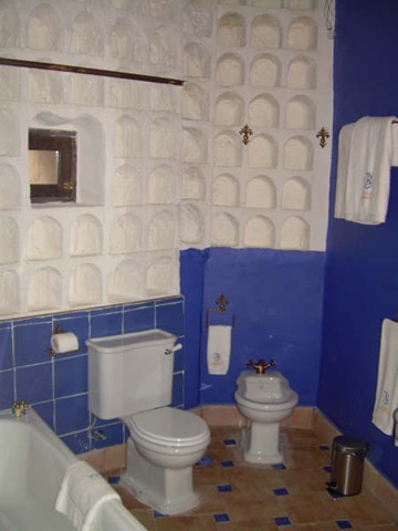 * nota: estos comentarios están hechos desde el sillón de la buena intención, a mis colegas que diseñan cuartos de baño como éstos y a los que diseñan cuartos de baño que no se parecen nada a éstos, a los promotores que quieren diseñar un cuarto de baño, a los que ya lo tienen y ven algo que no acaba de encajarles, a los que les gusta este cuarto de baño y a los que odian visceralmente unos cuartos de baño así, a los que les gusta el azul y a los que no, a los que ponemos cara de póker cuando llegamos a un hotel con un baño así y a los que piensan que "lo único que le falta a este baño para ser perfecto son unos pañitos con puntillas sobre la cisterna". A todos, con el cariño que me brinda la ironía, pero nunca el sarcasmo.