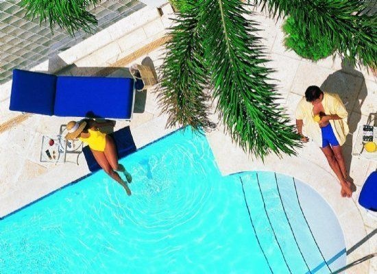 Lo mismo sucede con esta sugerente fotografía del hotel Blue Moon, de Miami. Chica mona, amante apuesto, bordes a ras de agua, palmeras tropicales… una composición sexy. Sin embargo, la piscina es una bagatela en un entorno feo y descuidado del hotel.